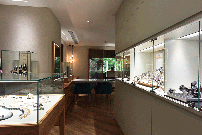 Due to an outdated style and poor visibility, the space had to be fully reviewed. With wider openings and displays, a new flooring and a complete new colour theme, custom made showcases and specialized lighting, the jewellery shop is now in perfect harmony with the surrounding hotel atmosphere.